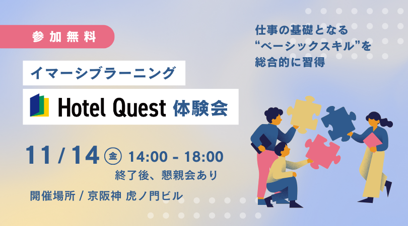ストーリーに主人公として没入し、問題解決に取り組む中で、さまざまな能力(ロジカルシンキング、コミュニケーション能力、段取り力、問題解決力)を身に付けて行くイマーシブラーニング・プログラム「Hotel Quest」を実際にご体験いただきます。通常1〜2日間程度の研修として各社様にご提供しているプログラムを、半日で無料受講していただくことができるセミナーです。